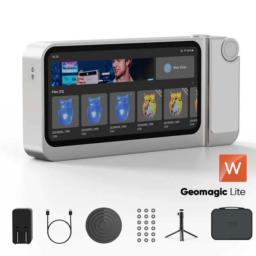 Incluye accesorios: Plataforma giratoria, Trípode, Estuche para transporte, marcadores, placa de calibración, Cargador y cable.